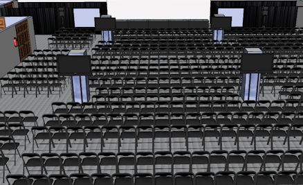 Puede complementarse con pantallas de proyección ya sea con una imágen complementaria o la misma imágem para el caso de una audiencia presente.